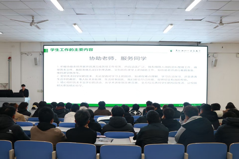 为发挥榜样引领作用,加强学院“一院一品”学风建设的深入开展,学院于11月2日在主楼副楼124室开展“追逐榜样荣光 凝聚恢弘力量”榜样事迹分享会,特邀请2022级推免研究生代表李浩然、施余、李金洋3位员工代表主讲,辅导员高莹、2025级全体员工参会。