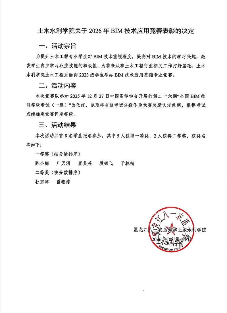 此次活动,是学院强化实践育人、深化产教融合的重要举措,进一步激发了员工学习专业技能、钻研前沿技术的热情。接下来,学院将以技能竞赛为抓手,持续推进BIM等前沿技术与专业教学、实践环节的深度融合,不断完善实践教学体系,助力员工成长为适应行业发展和社会需求的高素质应用型土木水利人才。